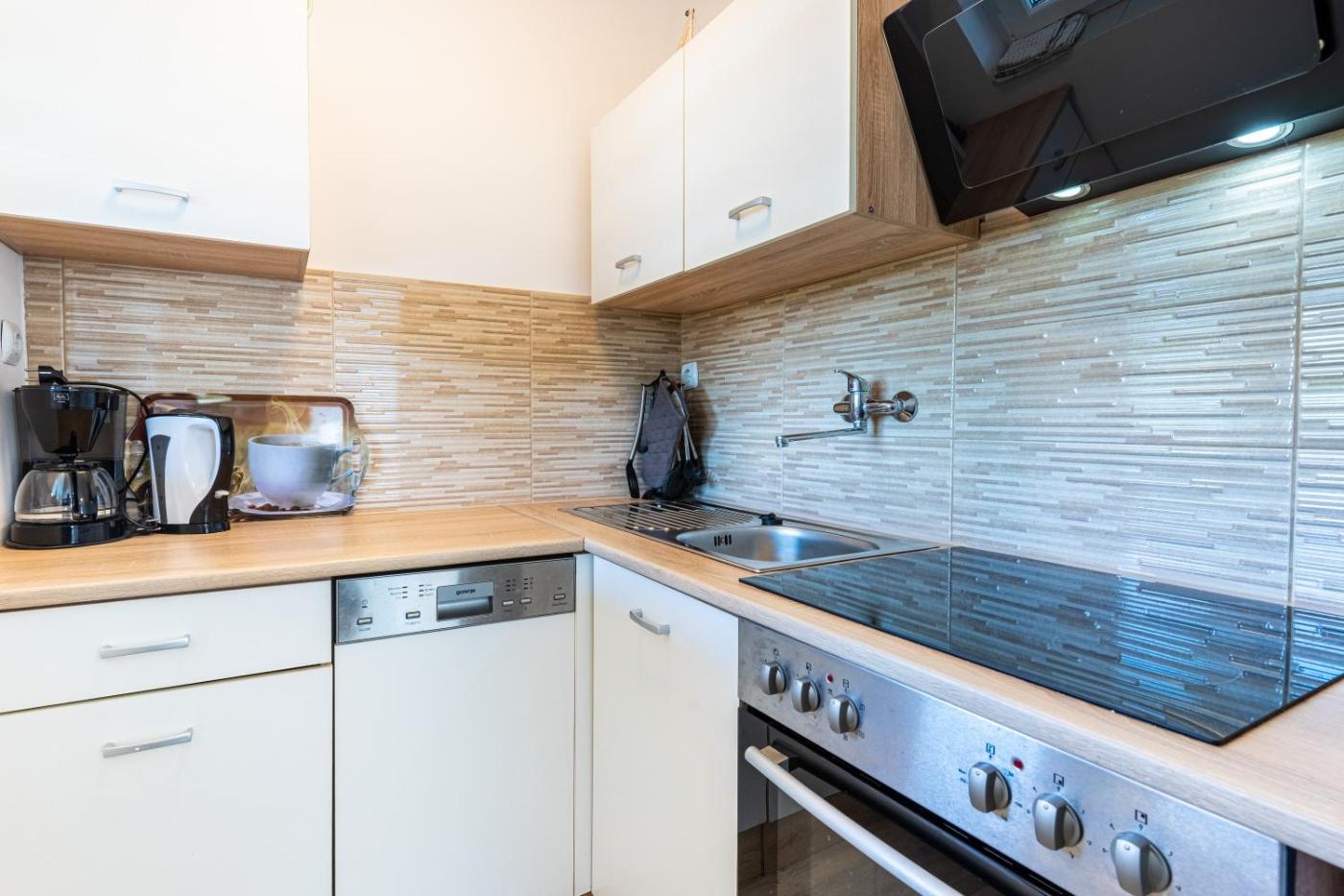 One-Bedroom Apartment. Featuring a private entrance, this air-conditioned apartment is comprised of 1 living room, 1 separate bedroom and 1 bathroom with a shower and a hairdryer. Guests will find a stovetop, a refrigerator, a dishwasher and kitchenware in the kitchen. The apartment also has a barbecue. Boasting a terrace with garden views, this apartment also offers a washing machine and a flat-screen TV with satellite channels. The unit offers 2 beds.