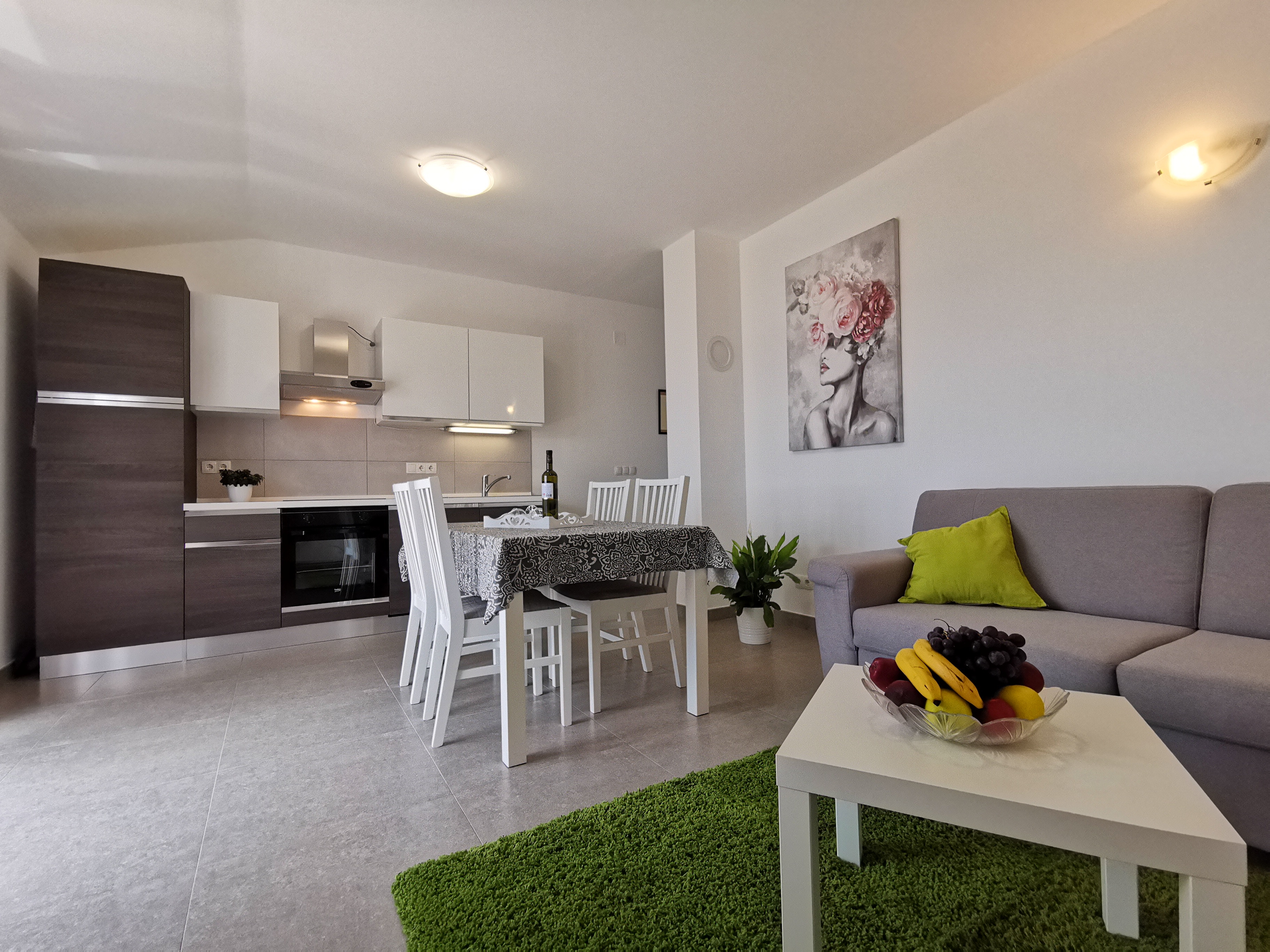 Apartment can accommodate 4 guests. Beds are situated in 1 sleeping rooms, but also in the living room, within 41m2. Guests can use a private terrace to enjoy the warm summer evenings. The apartment offers the sea view. For the booked accommodation unit the deposit is paid directly to the owner upon check-in (deposit amount is displayed on the website) INCLUDED IN THE PRICE: tourist tax, final cleaning, air-conditioning, parking, internet, hairdryer. OBLIGATORY ADDITIONAL COSTS: deposit (€100.00 one-time payment). The availability of additional services for your chosen dates of stay, as well as their prices (if none are listed) must be checked ahead of time. Any additional services not shown in the price calculation are payable directly to the property owner and only if used by the visitor.