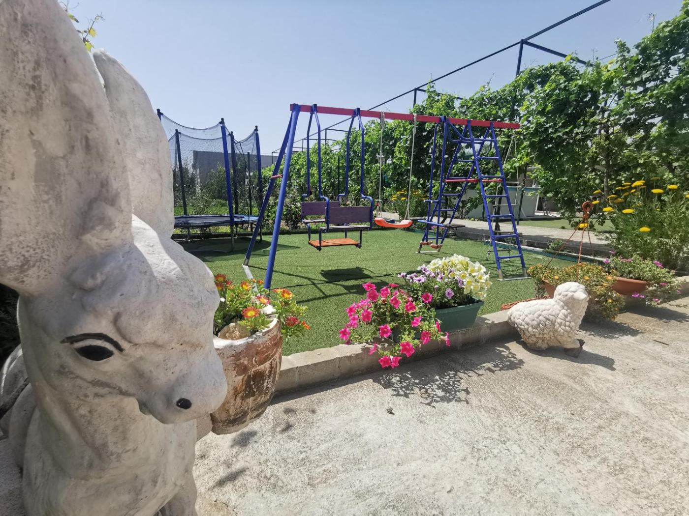 The apartment has an outdoor fireplace and a childrens playground.