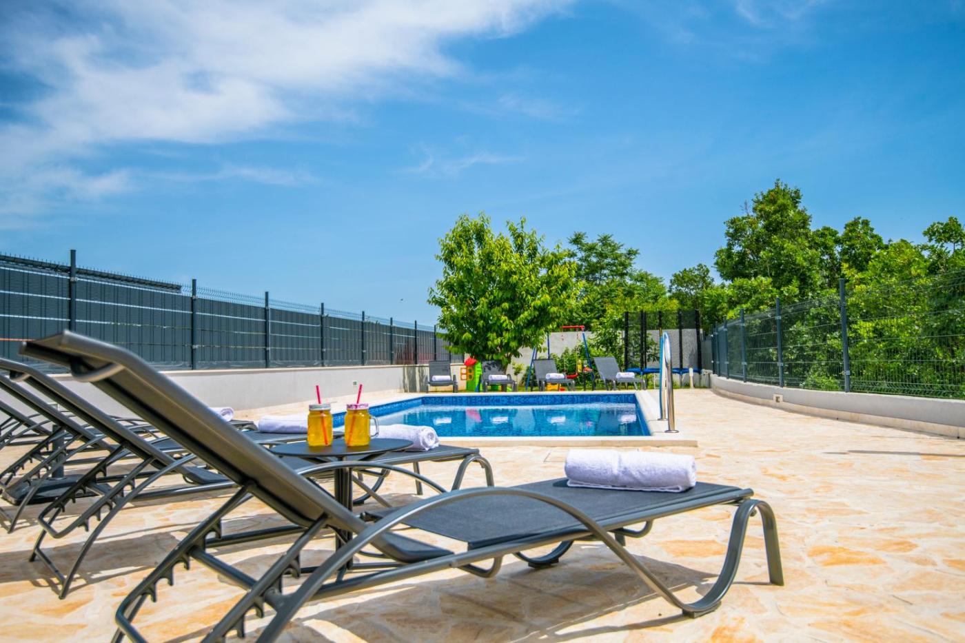 Five-Bedroom House. The private pool is the standout feature of this holiday home. Boasting a private entrance, this air-conditioned holiday home comes with 1 living room, 5 separate bedrooms and 3 bathrooms with a shower and a bidet. In the fully equipped kitchen, guests will find a refrigerator, a dishwasher, kitchenware and an oven. The spacious holiday home features a flat-screen TV with satellite channels, a washing machine, a tea and coffee maker, a seating area as well as garden views. The unit has 7 beds.