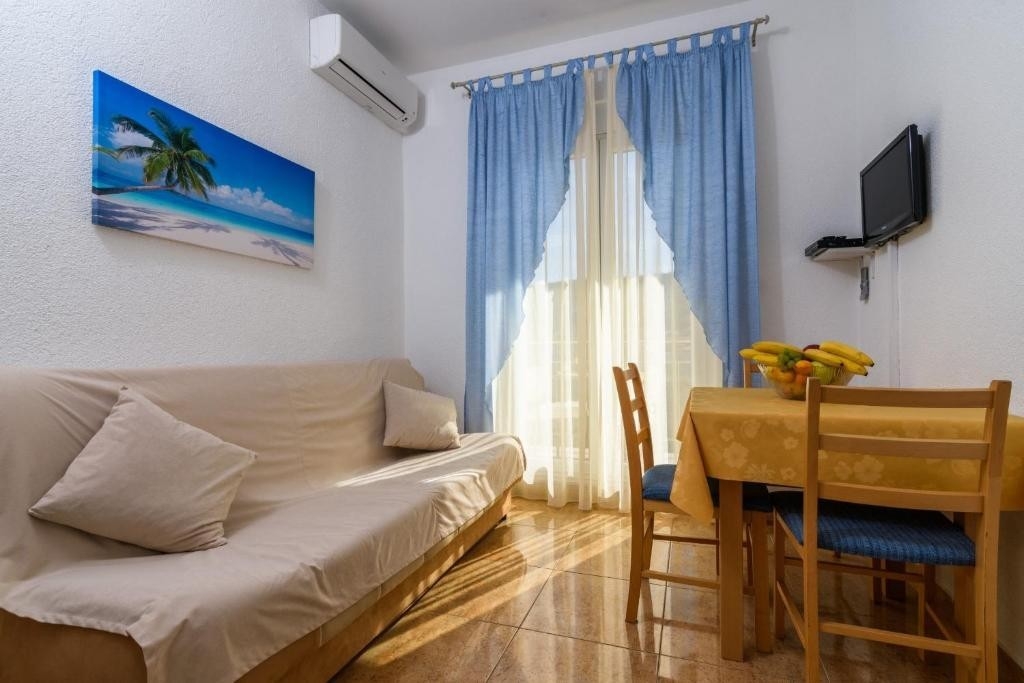 Apartment can accommodate 3 guests. Beds are situated in 1 sleeping rooms, but also in the living room, within 35m2. Guests can use a private balcony to enjoy the warm summer evenings. Food can be prepared using barbecue which is shared with other guests too. INCLUDED IN THE PRICE: tourist tax, final cleaning, air-conditioning, parking, internet, baby cot, hairdryer. OBLIGATORY ADDITIONAL COSTS: short stay fee (surcharge depending on a number of booked nights: 30% - 1, 20% - 2, 10% - 3). The availability of additional services for your chosen dates of stay, as well as their prices (if none are listed) must be checked ahead of time. Any additional services not shown in the price calculation are payable directly to the property owner and only if used by the visitor. Discounts to the base price: free day 21=19 (for reservations of 21 or more days you get 2 free days for the stay until 31122026).
