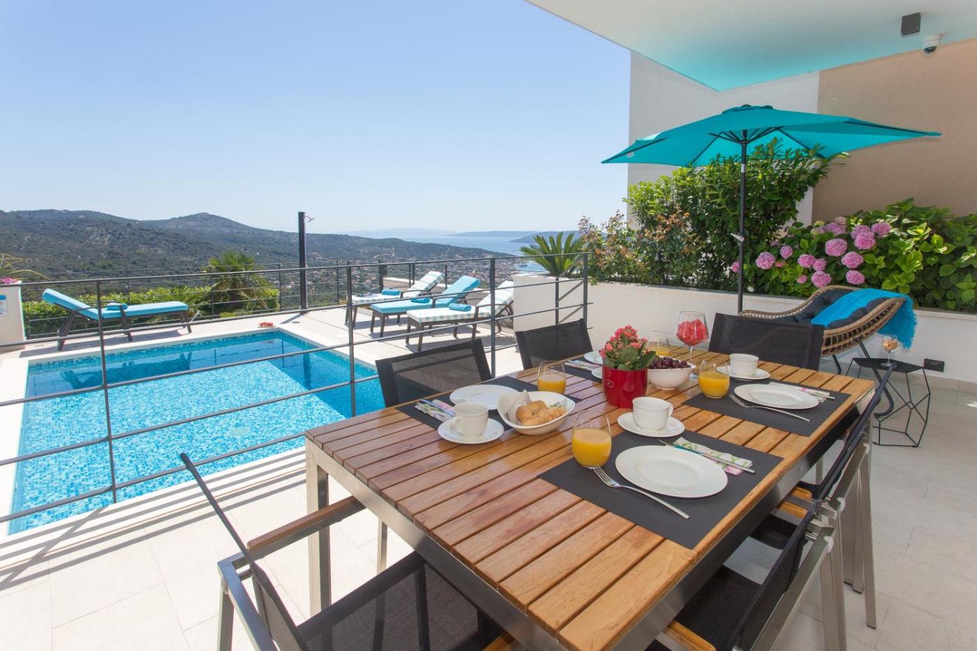 Villa with Sea View. This villas special feature is the pool with a view. Featuring a private entrance, this air-conditioned villa consists of 1 living room, 3 separate bedrooms and 3 bathrooms with a shower and a hairdryer. Guests will find a stovetop, a refrigerator, a dishwasher and kitchenware in the kitchen. The villa also offers a barbecue. Boasting a terrace with sea views, this villa also provides a washing machine and a flat-screen TV with streaming services. The unit offers 4 beds.