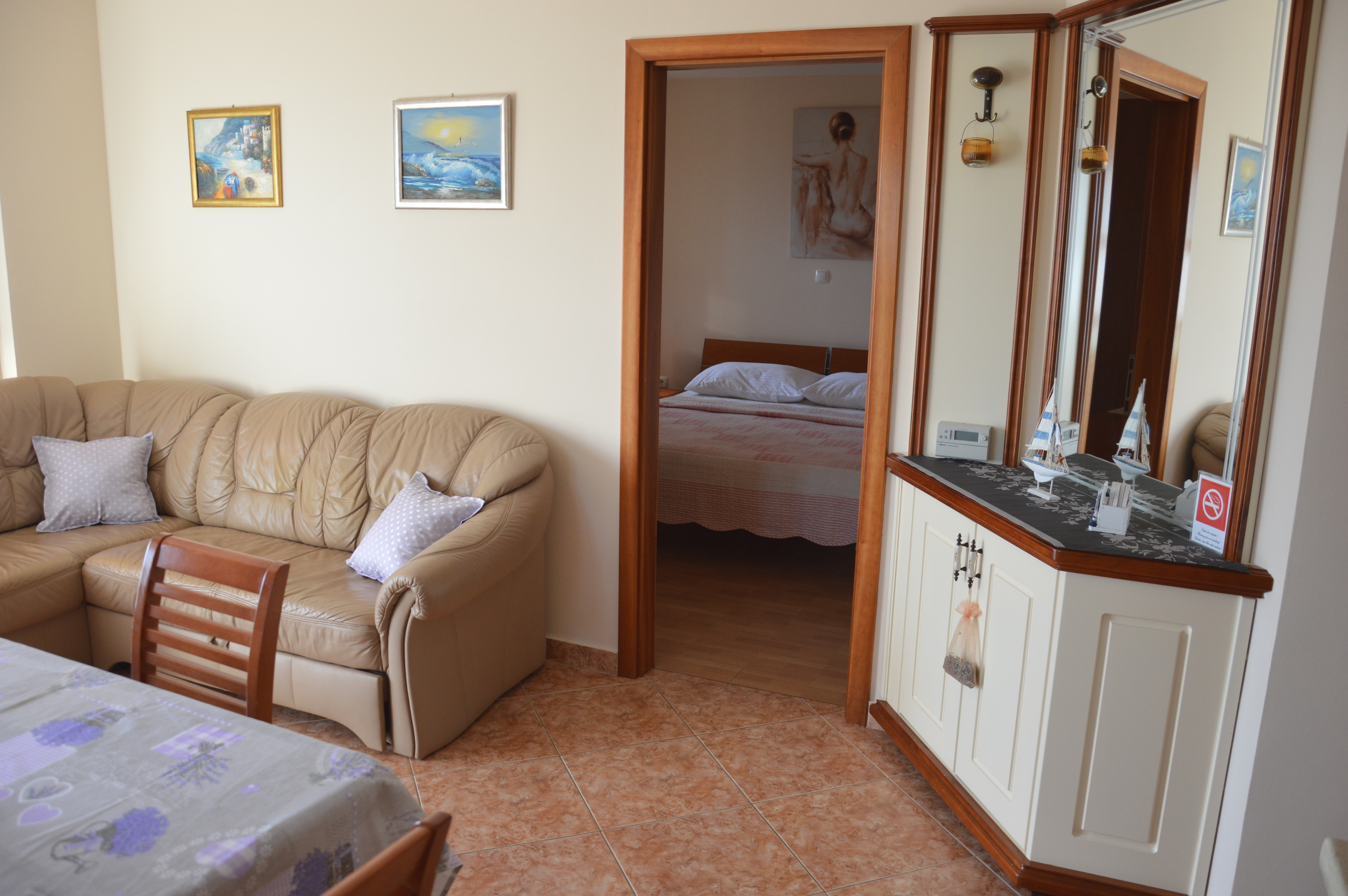 Apartment can accommodate 4 guests. Beds are situated in 1 sleeping rooms, but also in the living room, within 37m2. Guests can use a private terrace to enjoy the warm summer evenings. The apartment offers the sea view. Food can be prepared using barbecue which is shared with other guests too. INCLUDED IN THE PRICE: tourist tax, final cleaning, air-conditioning, central heating, parking, internet, baby cot, hairdryer. The availability of additional services for your chosen dates of stay, as well as their prices (if none are listed) must be checked ahead of time. Any additional services not shown in the price calculation are payable directly to the property owner and only if used by the visitor.